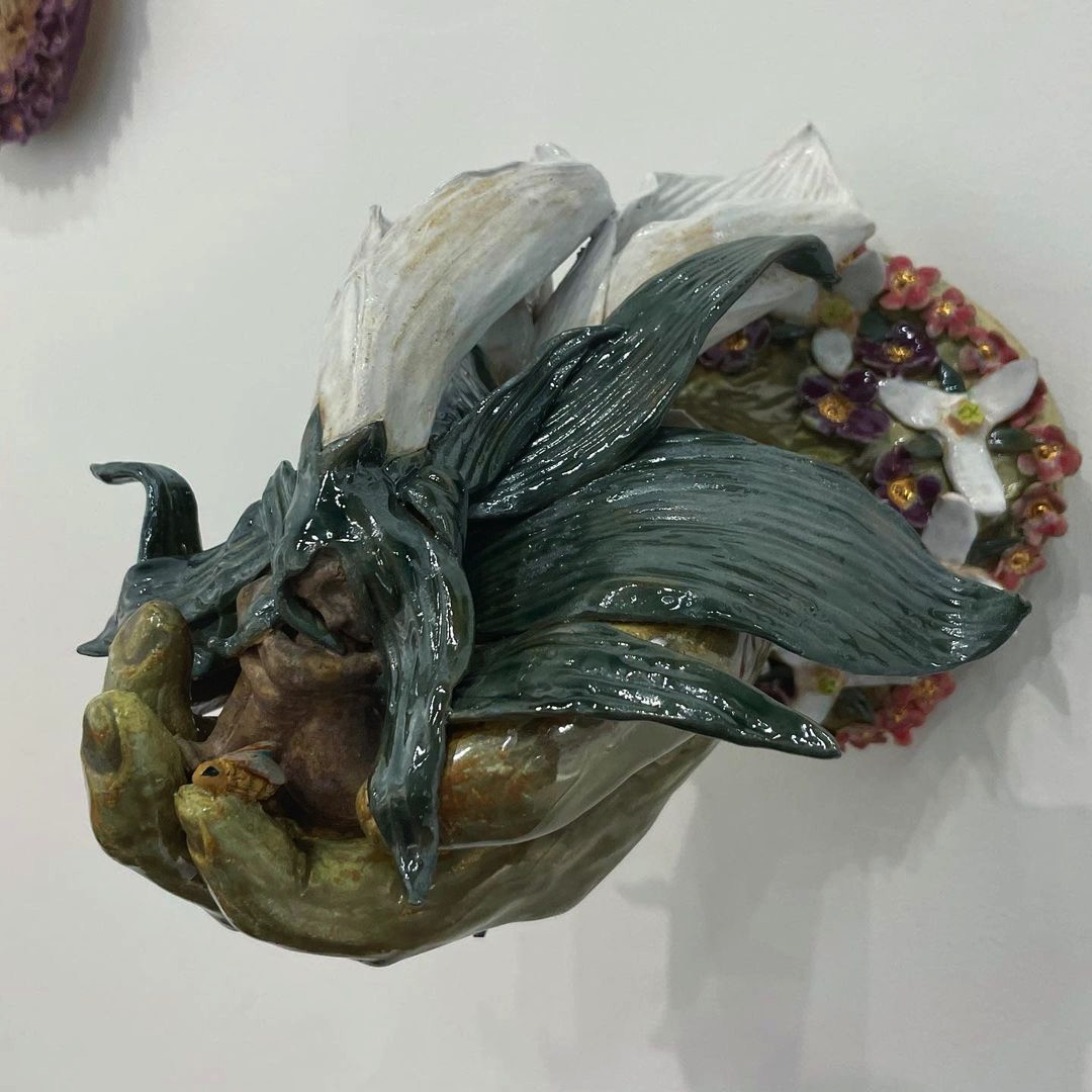 The theme of my senior exhibition, “Telling the Bees,” references the practice in which beekeepers have a responsibility to notify the bees of major life changes such as deaths, births, and rites of passage as an aspect of their care. I explore through metaphor the hive as a nest, tomb, shrine, medicine chest, portal, container, and oracle. The themes of motherhood, marriage, and grief are presented visually through various mediums, including drawings, prints, hand-built ceramics, and fiber arts like stitching and weaving, each presenting layered visual metaphors.